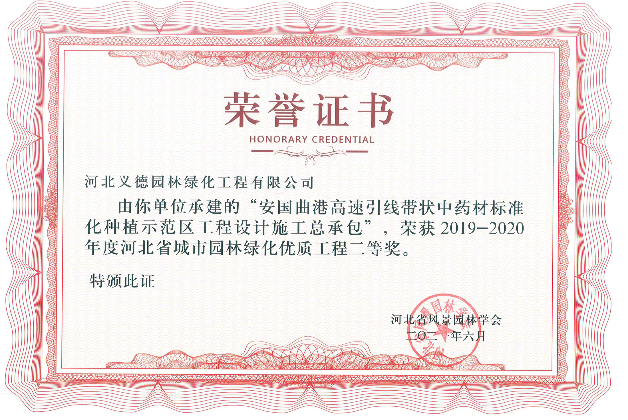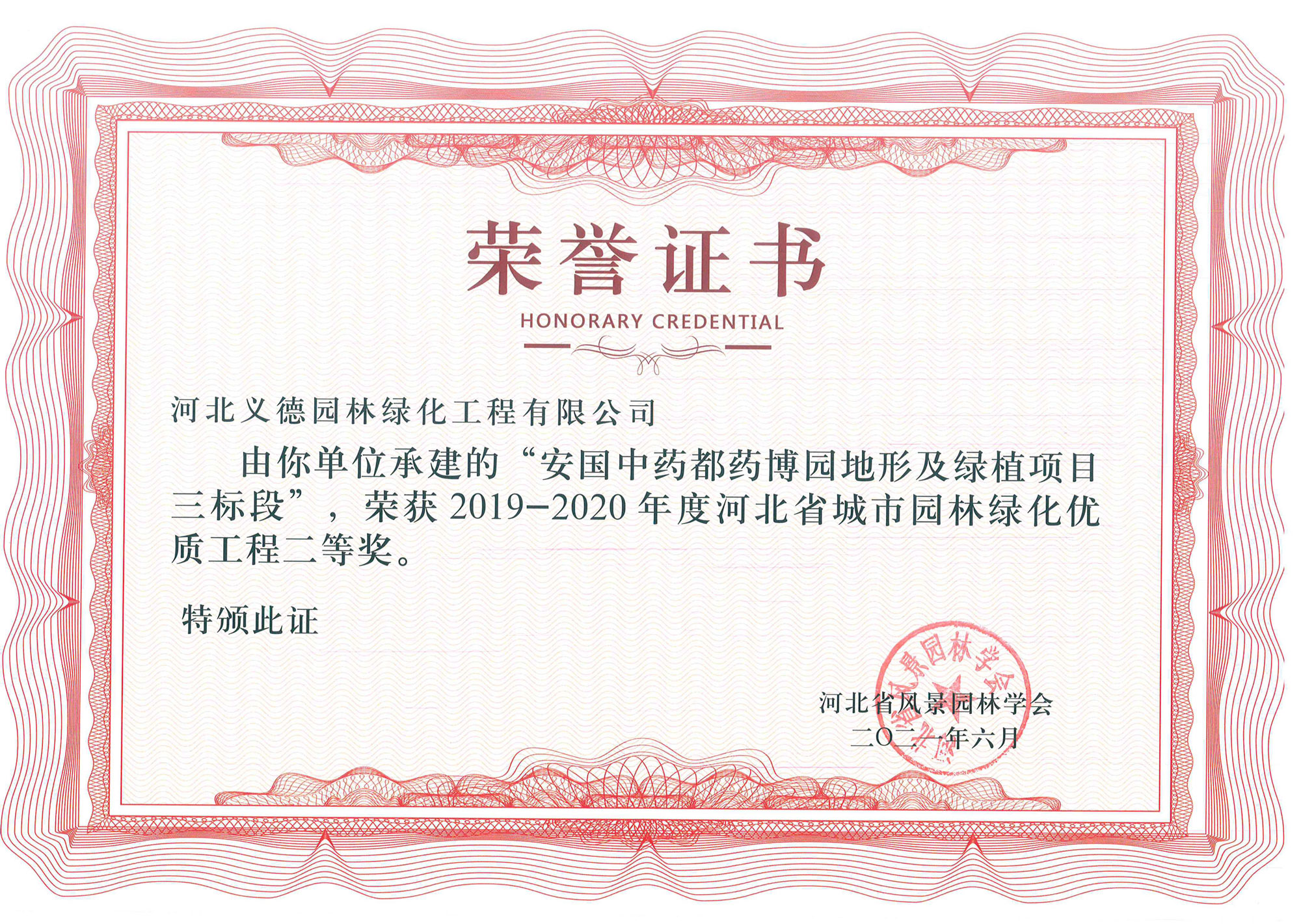 工程業(yè)績榮獲有2017-2018年度河北省城市園林綠化優(yōu)質(zhì)工程二等獎兩個;2019-2020年度河北省城市園林綠化優(yōu)質(zhì)工程二等獎兩個、三等獎兩個;2018至2020年保定市燕趙杯優(yōu)質(zhì)工程五個;2020年度石家莊市優(yōu)質(zhì)工程一個。